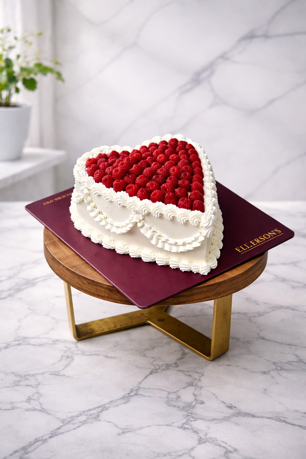 A classic heart shaped cake topped generously with fresh raspberries. Finished with delicate hand piped cream detailing, this cake is a perfect balance of Elegance, freshness and subtle sweetness .