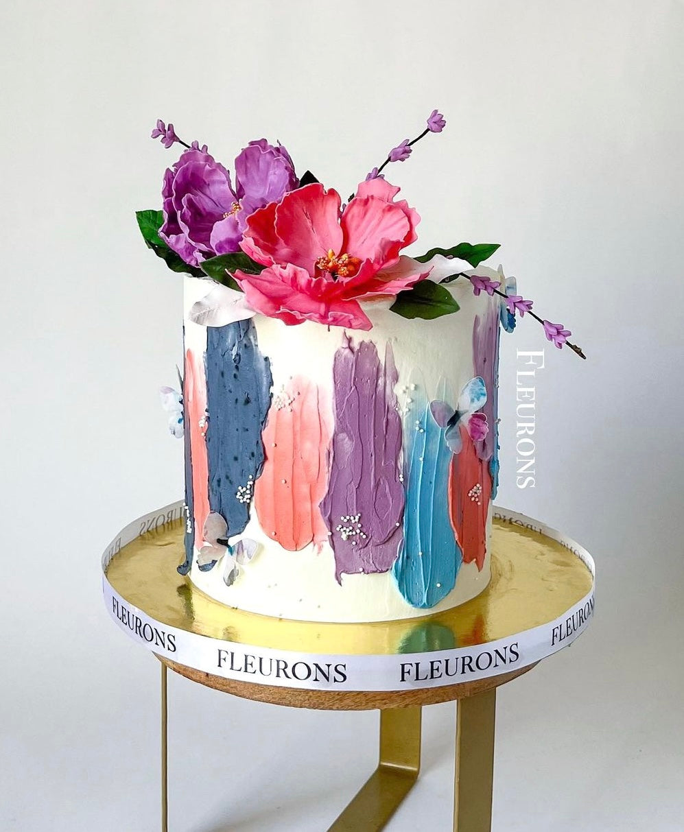 Featuring here is a 2Kgs Tall (Non fondant) off-white cake, with textures of blue, lilac, peach and pink on its height. Edible pearls and butterfly are added to highlight these textures.