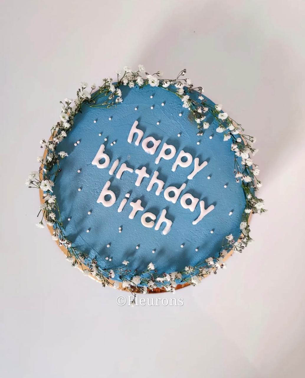 Featuring here is a 1kg cake (non fondant) in a shade of blue, with pearls sprinkled around the text, enclosed by a beautiful circumference of gypsophilla.