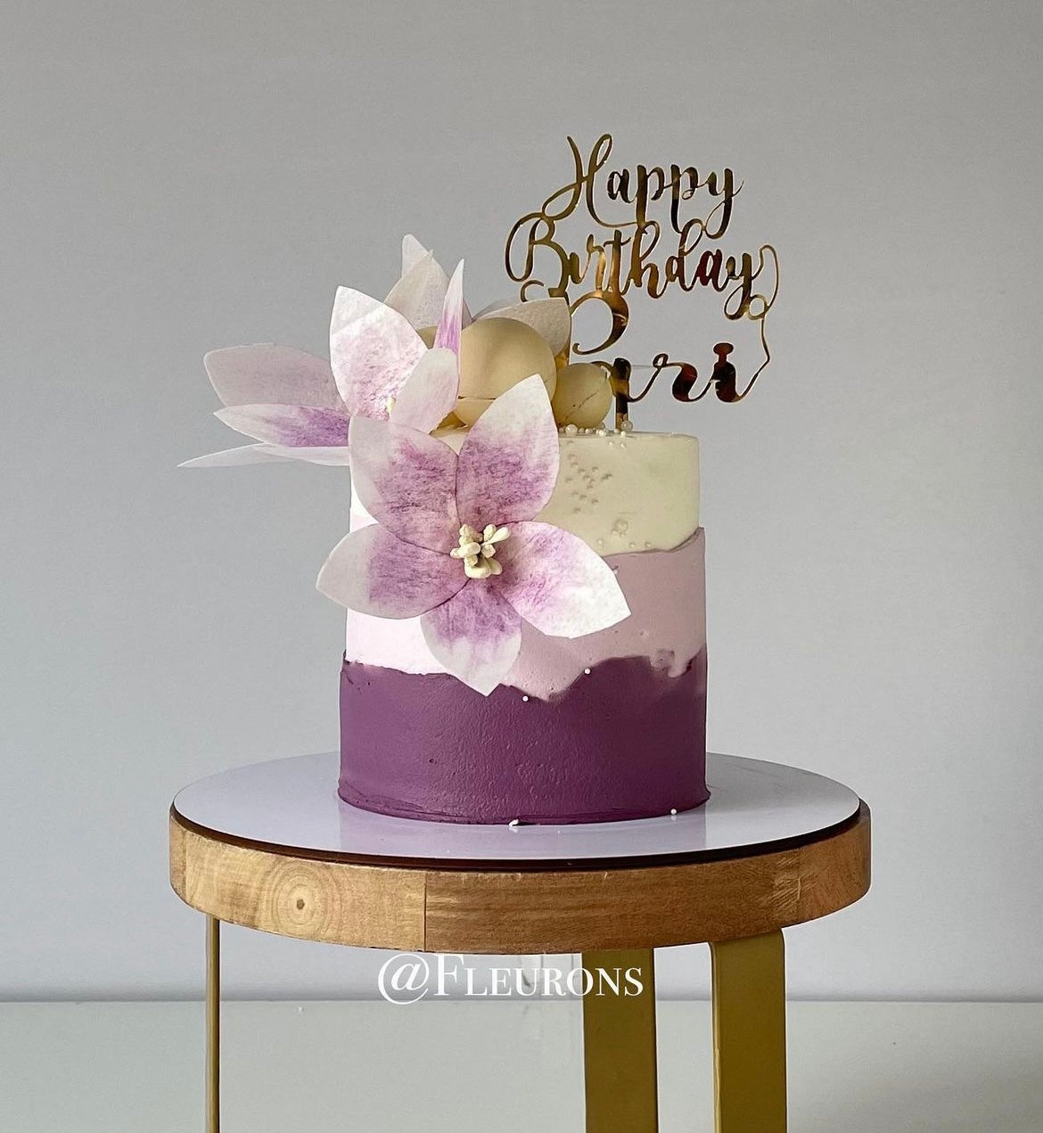 Featuring here is a 1.5kgs Cake (non fondant), layered with shades of purple cream, adorned with edible pearls, chocolate spheres and edible wafer paper flowers.
